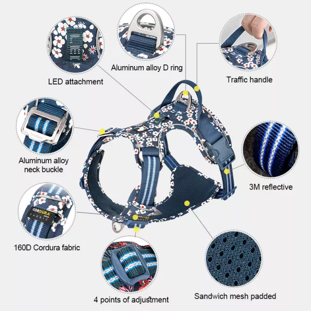 The harness features lightweight aluminum accessories that resist rust and add a premium touch. With its soft, breathable padding, it ensures a comfortable fit that reduces strain on your pet’s neck and chest, even during long walks or training sessions. The reflective stitching provides extra visibility for night strolls, giving you peace of mind wherever you go.