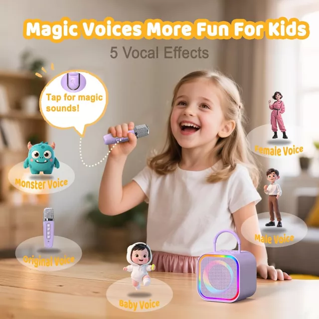 This karaoke machine is packed with entertainment! It includes five fun sound effects—Monster, Baby, Female, Male, and Original—so kids can experiment with different voices and get creative while singing or storytelling. The dynamic LED lights flash and pulse to the beat of the music, creating an instant party atmosphere. Bluetooth 5.3 connectivity ensures a stable, fast, and wireless connection up to 50 feet, while multiple input options (TF card, USB, AUX) make it easy to play music from phones, tablets, or computers.